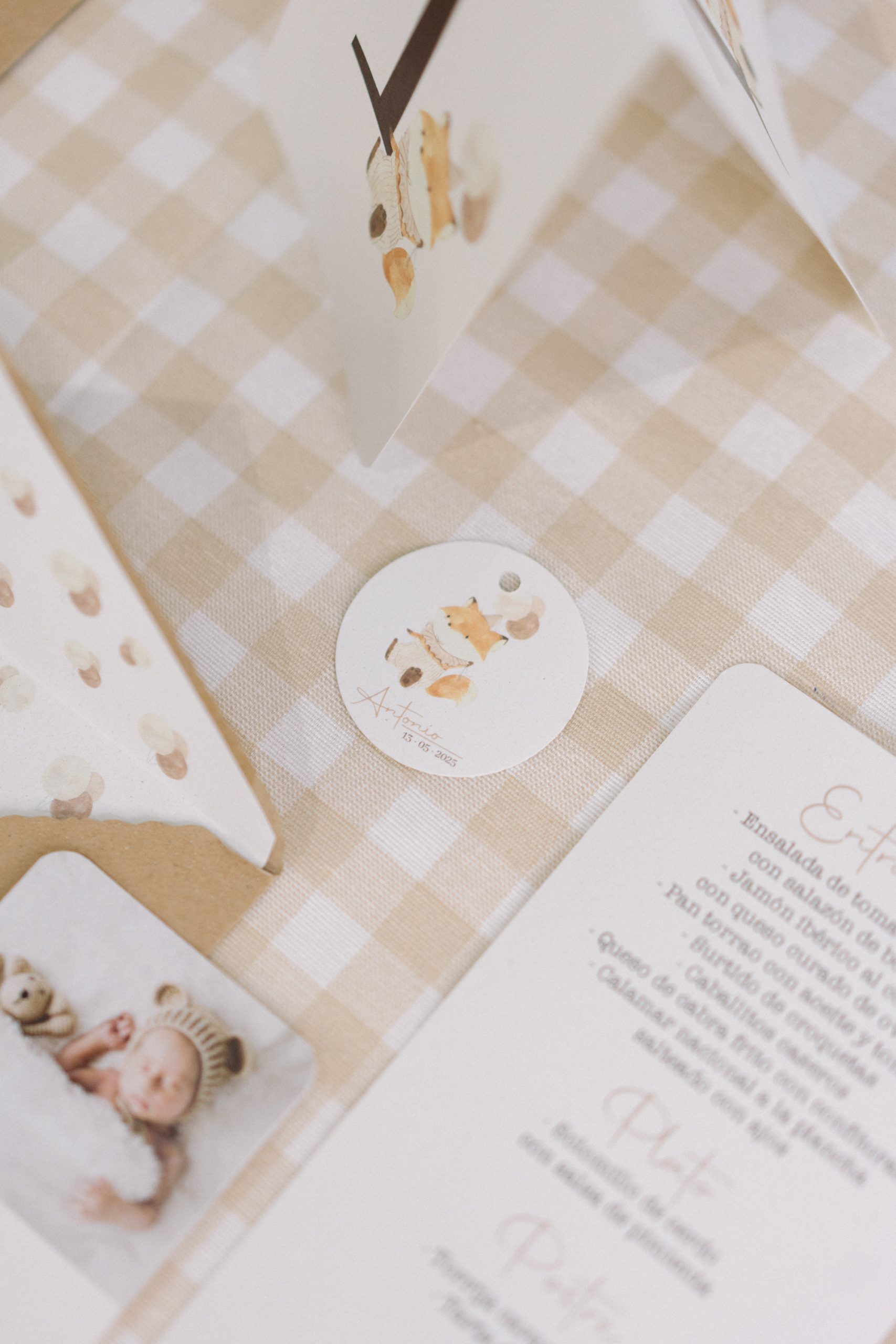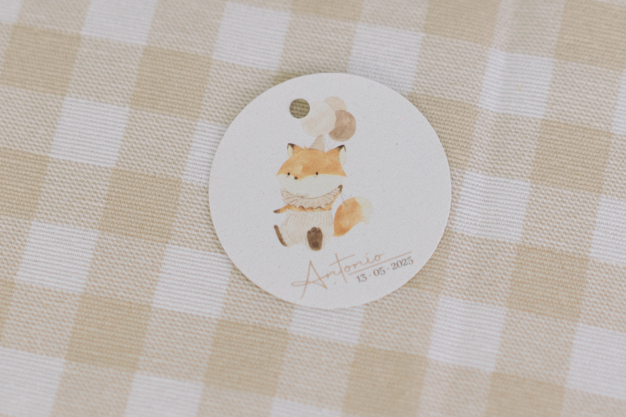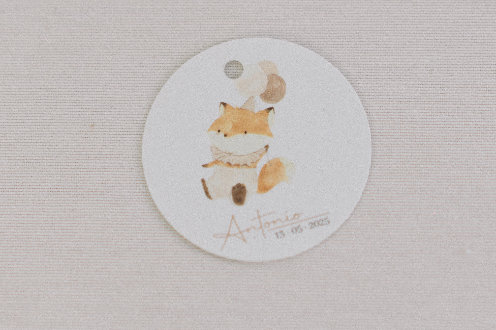 Cada etiqueta se personaliza con el nombre del niño o niña, la fecha del evento o el texto que desees, todo acompañado por los adorables elementos visuales de la colección, como el icónico zorrito ilustrado.