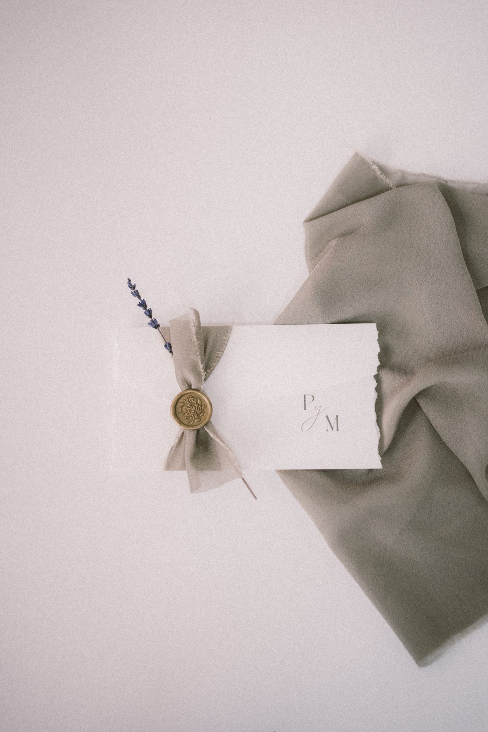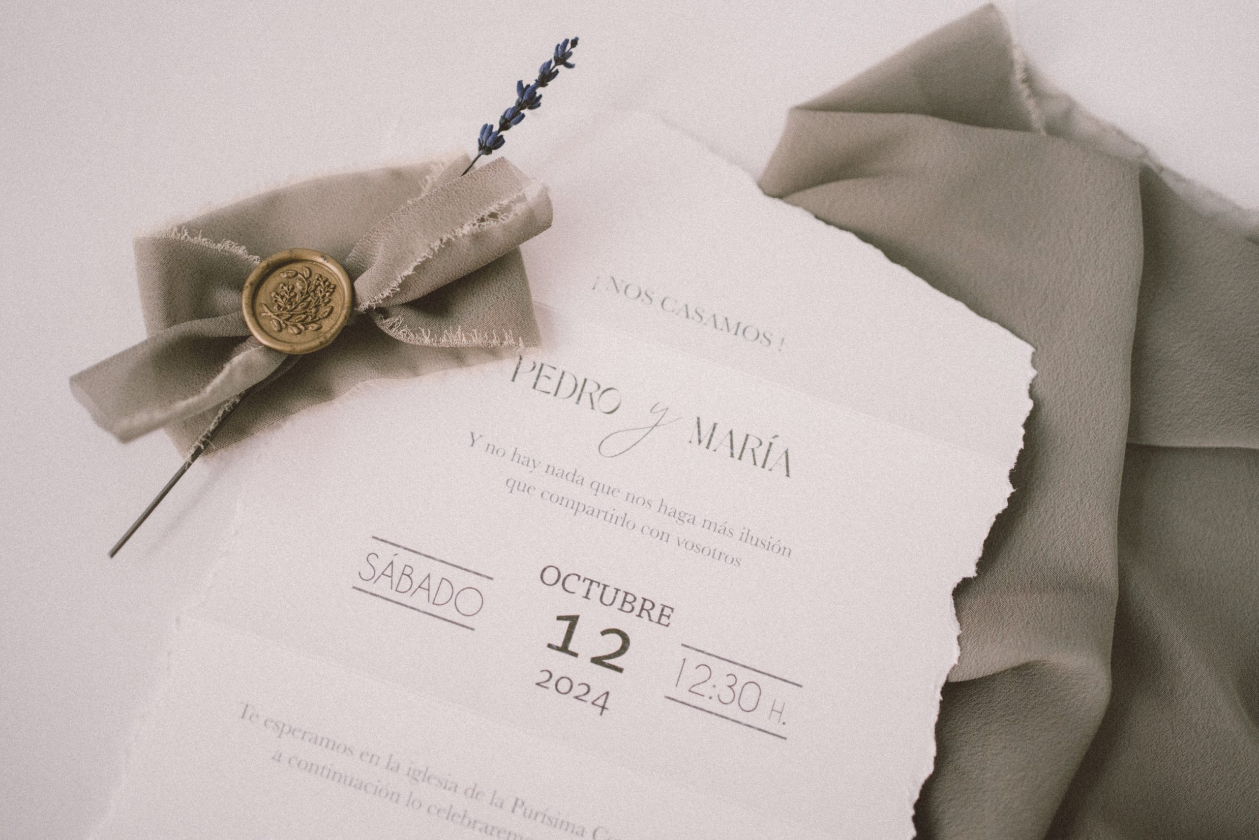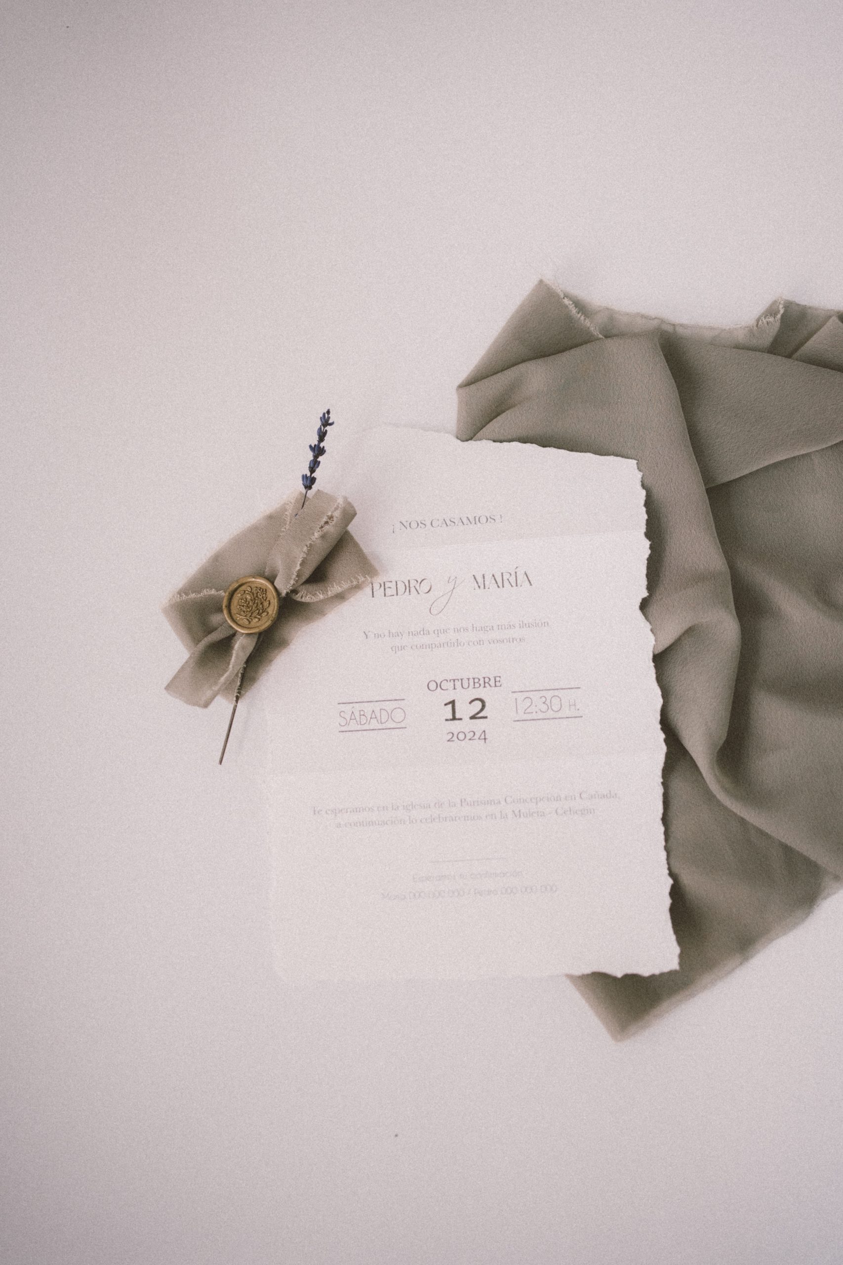 Gracias a su diseño envolvente, la propia invitación se convierte en su sobre, cerrándose con un delicado lazo incluido que aporta ese toque final de romanticismo y sutileza.